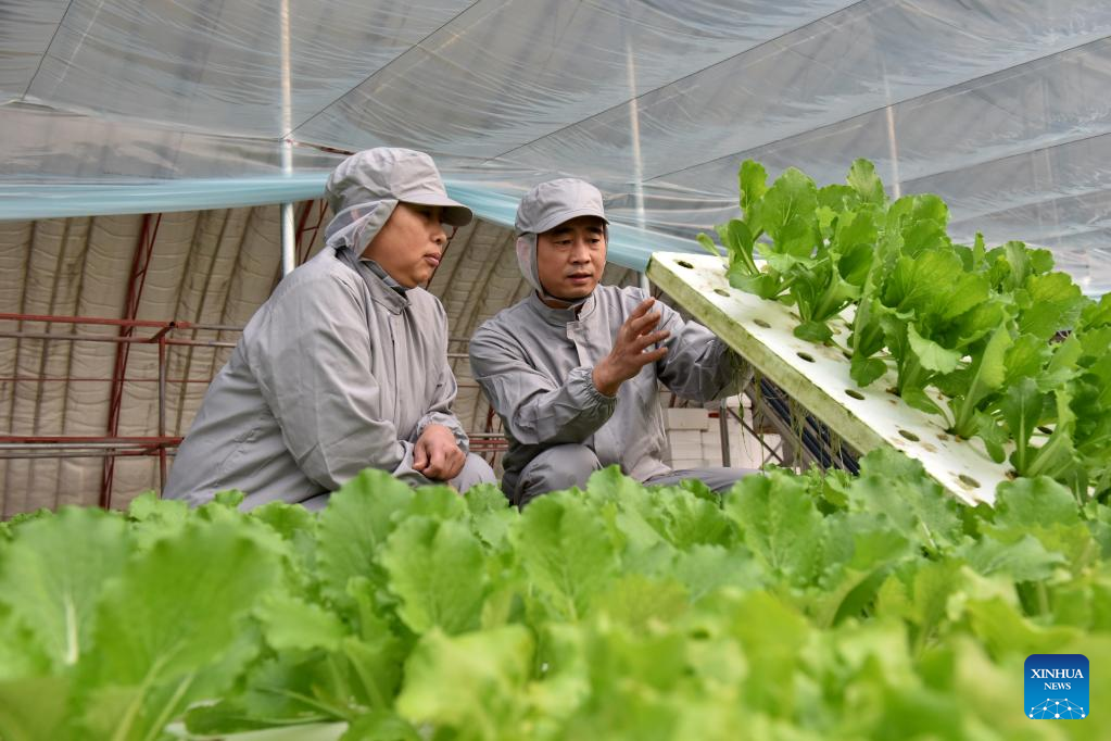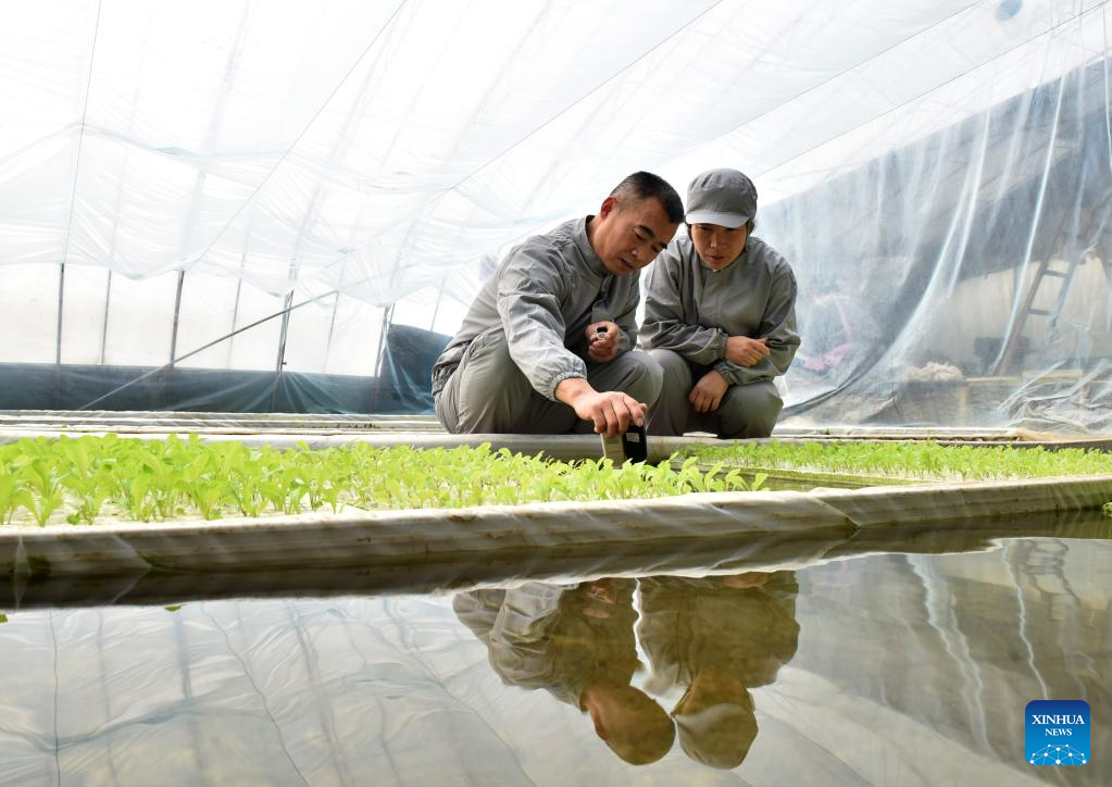 Farmer Zhang Zhaoke (L) checks on the nutrition solution in a hydroponic farming greenhouse in Xingtai, north China's Hebei Province, Feb. 12, 2022. In 2020, Zhang invested in a hydroponic farming business which produces greenhouse vegetables. (Xinhua/Zhu Xudong)