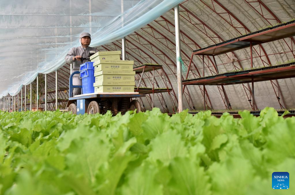 Farmer Zhang Zhaoke transfers vegetables in a hydroponic farming greenhouse in Xingtai, north China's Hebei Province, Feb. 12, 2022.