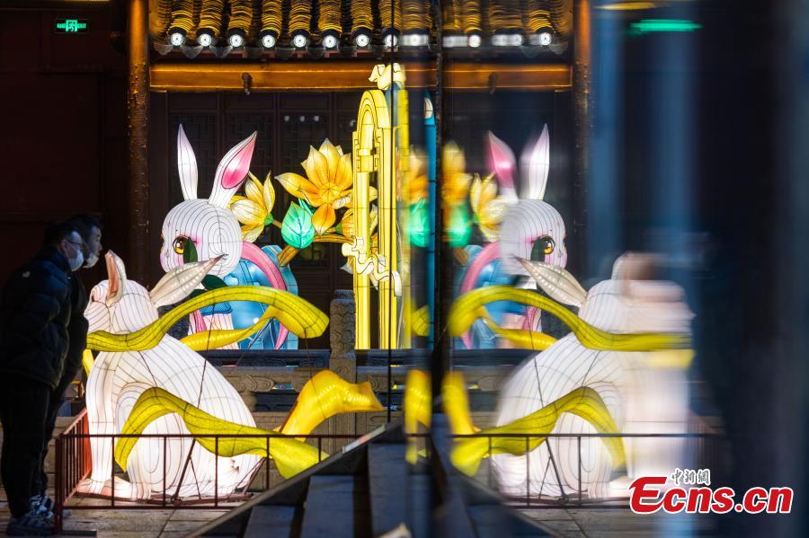 People view lanterns ahead of the Lantern Festival at Nanjing Confucius Temple (Fuzimiao) in east China's Jiangsu Province, Feb. 13, 2022. The Lantern Festival, celebrated on the 15th day of the first month of the Chinese lunar calendar, falls on Tuesday this year. It features family reunions, feasts and various cultural activities. (Photo: China News Service/Yang Bo)