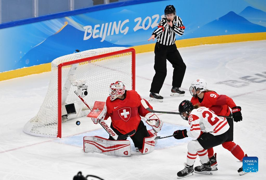 Goalkeeper Andrea Braendli (L) of Switzerland misses a goal during the ice hockey women's play-off semifinal between Canada and Switzerland at Wukesong Sports Centre in Beijing, capital of China, Feb. 14, 2022. (Xinhua/Li Ran)