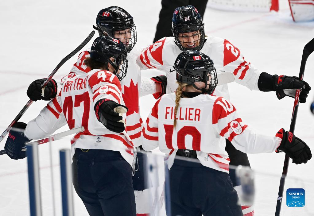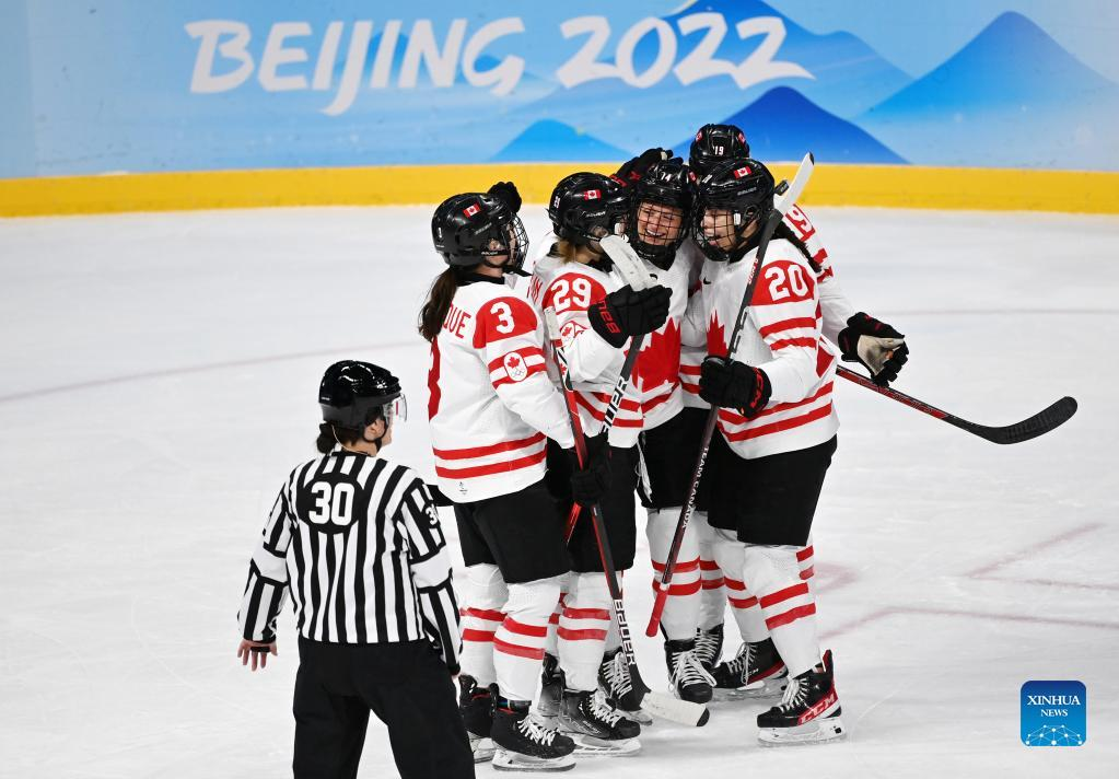 Athletes of Canada celebrate scoring during the ice hockey women's play-off semifinal between Canada and Switzerland at Wukesong Sports Centre in Beijing, capital of China, Feb. 14, 2022. (Xinhua/Li Ran)