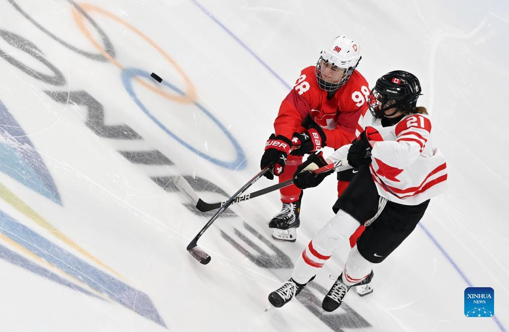 Ashton Bell (R) of Canada vies with Keely Moy of Switzerland during the ice hockey women's play-off semifinal between Canada and Switzerland at Wukesong Sports Centre in Beijing, capital of China, Feb. 14, 2022. (Xinhua/Li Ran)