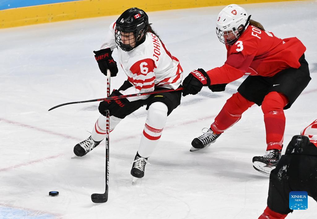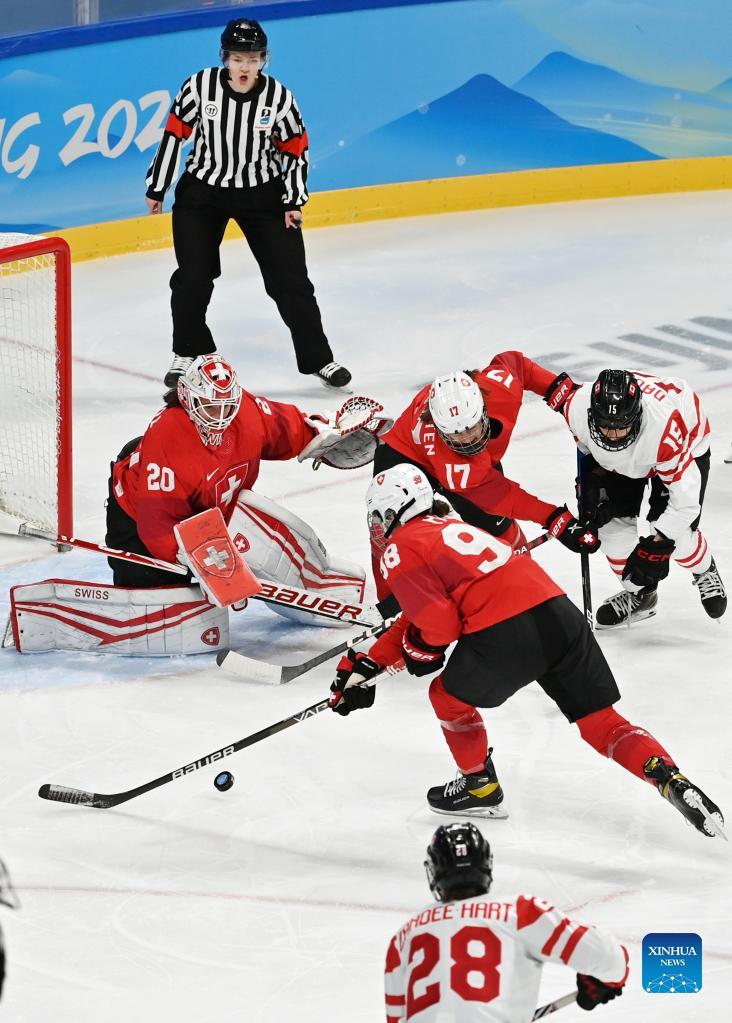 Keely Moy (3rd R) of Switzerland competes during the ice hockey women's play-off semifinal between Canada and Switzerland at Wukesong Sports Centre in Beijing, capital of China, Feb. 14, 2022. (Xinhua/Li Ran)