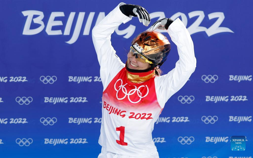 Xu Mengtao of China reacts during the freestyle skiing women's aerials qualification of Beijing 2022 Winter Olympics at Genting Snow Park in Zhangjiakou, north China's Hebei Province, Feb. 14, 2022. (Xinhua/Fei Maohua)