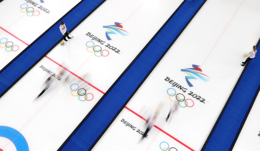 Athletes participate in training before the Curling Women's Round Robin Session 8 of the Beijing 2022 Winter Olympics between Japan and South Korea at the National Aquatics Centre in Beijing, capital of China, Feb. 14, 2022. (Xinhua/Huang Xiaobang)