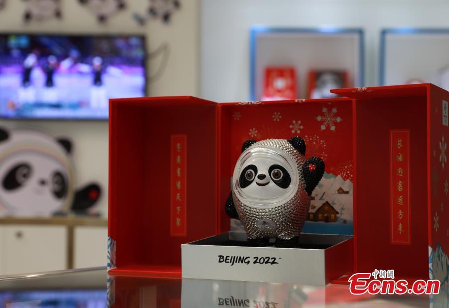 A diamond-encrusted Bing Dwen Dwen, mascot of Beijing 2022 Winter Olympics, is on display at an authorized merchandise store in Zhengzhou, Central China's Henan Province, Feb. 14, 2022. (Photo: China News Service/Kan Li)