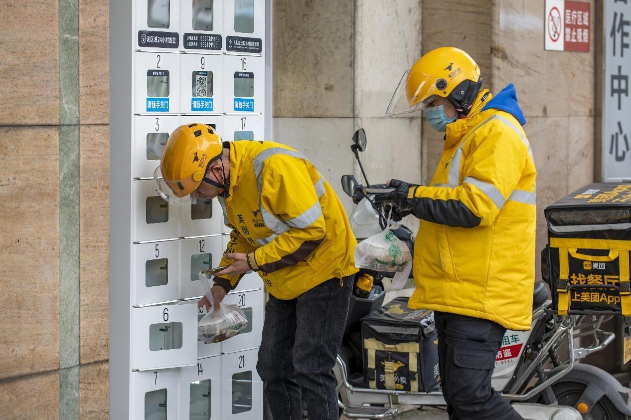Couriers put food into a smart locker at the gate of a hospital in Jinhua, east China's Zhejiang province. (People's Daily Online/Hu Xiaofei)