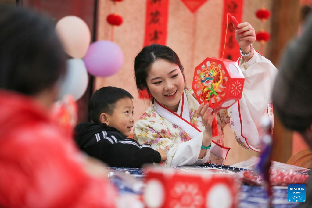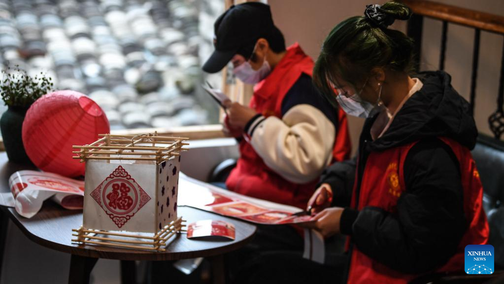 People make lanterns to celebrate the Lantern Festival in Huzhou City, east China's Zhejiang Province, Feb. 15, 2022. The Lantern Festival, the 15th day of the first month of the Chinese lunar calendar, falls on Feb. 15 this year. (Photo by Wang Zheng/Xinhua)