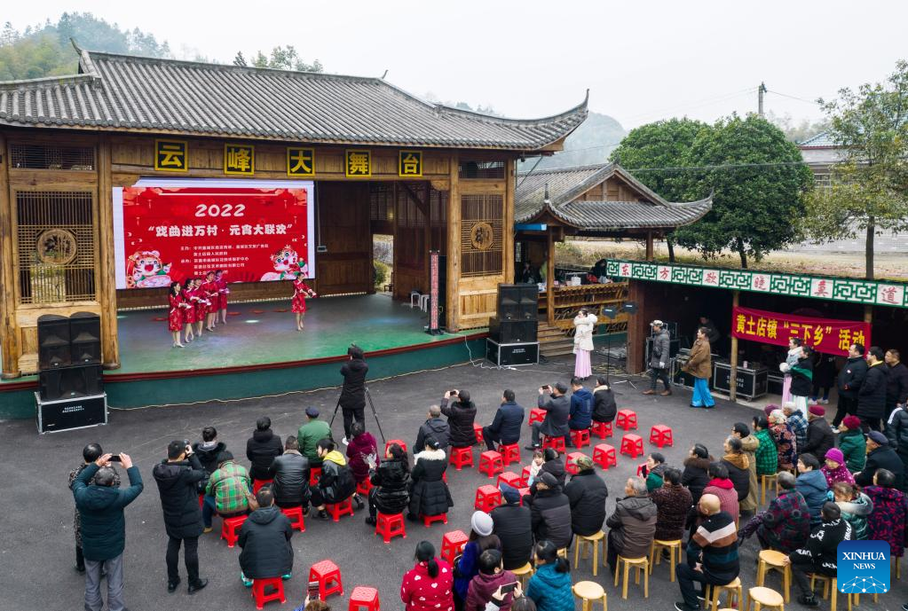 Aerial photo taken on Feb. 15, 2022 shows artists performing local opera to celebrate the Lantern Festival in Changde, central China's Hunan Province. The Lantern Festival, the 15th day of the first month of the Chinese lunar calendar, falls on Feb. 15 this year. (Xinhua/Chen Sihan)