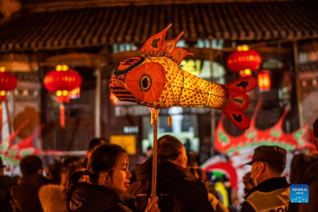 A local villager holding a fish-shaped lantern parades to celebrate the Lantern Festival in Wangmantian Village, Shexian County of Huangshan City, east China's Anhui Province, Feb. 14, 2022. The Lantern Festival, the 15th day of the first month of the Chinese lunar calendar, falls on Feb. 15 this year. (Photo by Shui Congze/Xinhua)
