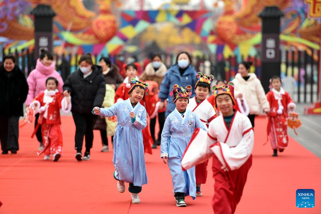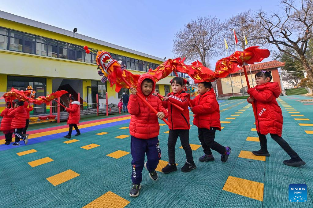 Kindergarten children play dragon dance to celebrate the Lantern Festival in Qingzhou City, east China's Shandong Province, Feb. 15, 2022. The Lantern Festival, the 15th day of the first month of the Chinese lunar calendar, falls on Feb. 15 this year. (Photo by Wang Jilin/Xinhua)