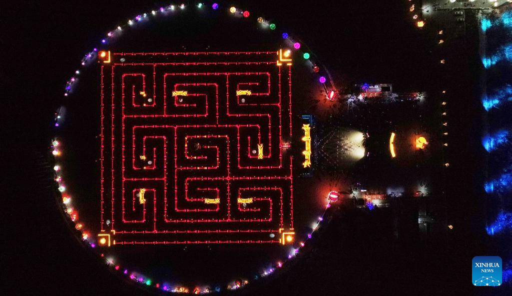Aerial photo taken on Feb. 14, 2022 shows a performance celebrating the Lantern Festival, in Yanchi County, northwest China's Ningxia Hui Autonomous Region. The Lantern Festival, the 15th day of the first month of the Chinese lunar calendar, falls on Feb. 15 this year. (Xinhua/Wang Peng)