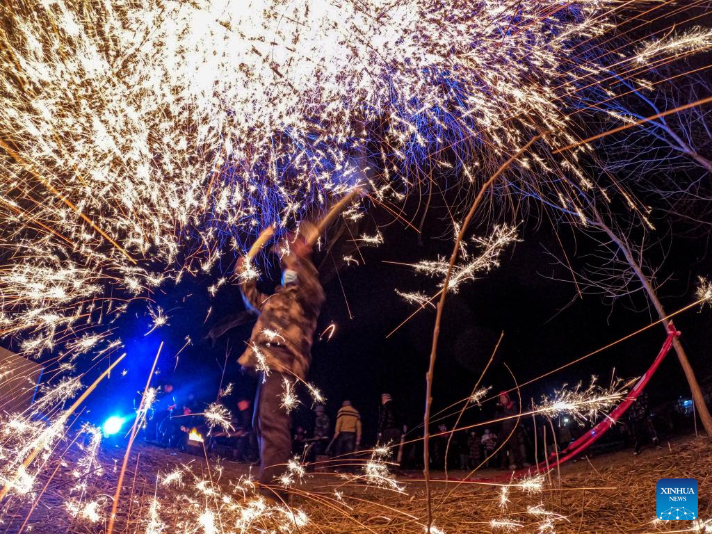 A villager throws molten iron to create fireworks to celebrate the Lantern Festival in Zoucheng, east China's Shandong Province, Feb. 14, 2022. The Lantern Festival, the 15th day of the first month of the Chinese lunar calendar, falls on Feb. 15 this year. (Photo by Han Jun/Xinhua)