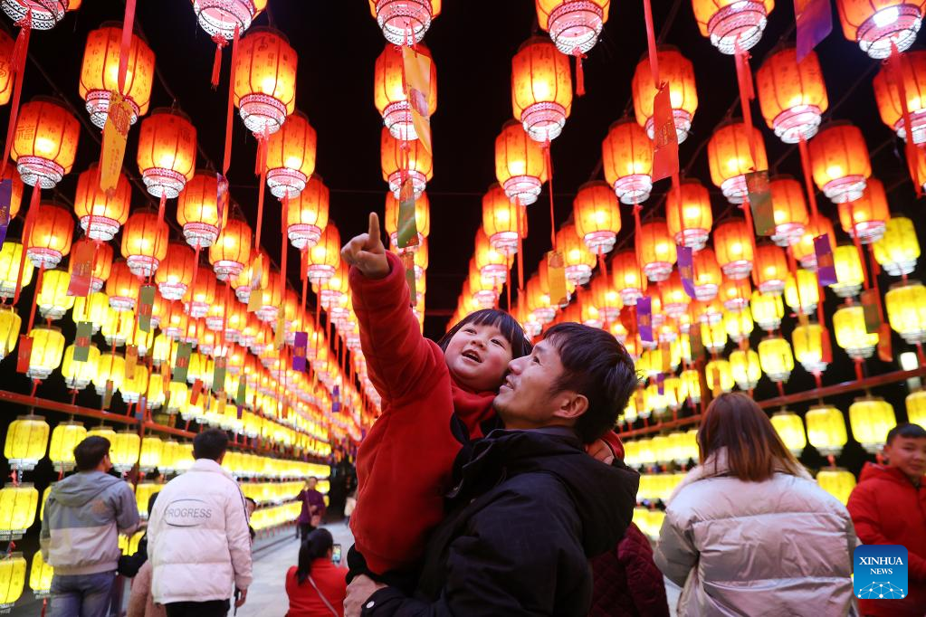 People visit a lantern fair to celebrate the Lantern Festival in Danzhai County, southwest China's Guizhou Province, Feb. 14, 2022. The Lantern Festival, the 15th day of the first month of the Chinese lunar calendar, falls on Feb. 15 this year. (Photo by Huang Xiaohai/Xinhua)