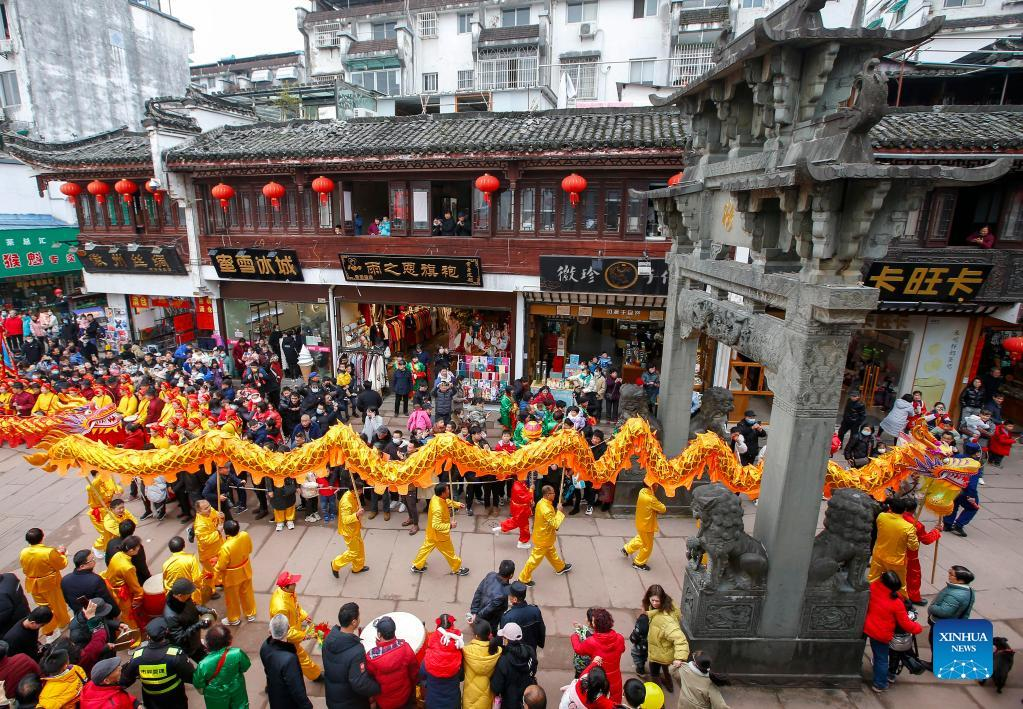 People perform dragon dance to celebrate the Lantern Festival in Tunxi old town of Huangshan, east China's Anhui Province, Feb. 15, 2022. The Lantern Festival, the 15th day of the first month of the Chinese lunar calendar, falls on Feb. 15 this year. (Photo by Shi Yalei/Xinhua)