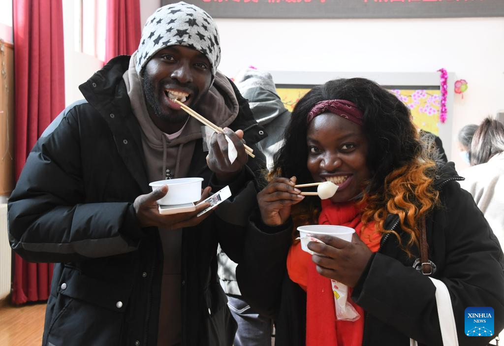 Overseas students taste glutinous rice balls to celebrate the Lantern Festival, in Beijing, capital of China, Feb. 15, 2022. The Lantern Festival, the 15th day of the first month of the Chinese lunar calendar, falls on Feb. 15 this year. (Xinhua/Ren Chao)