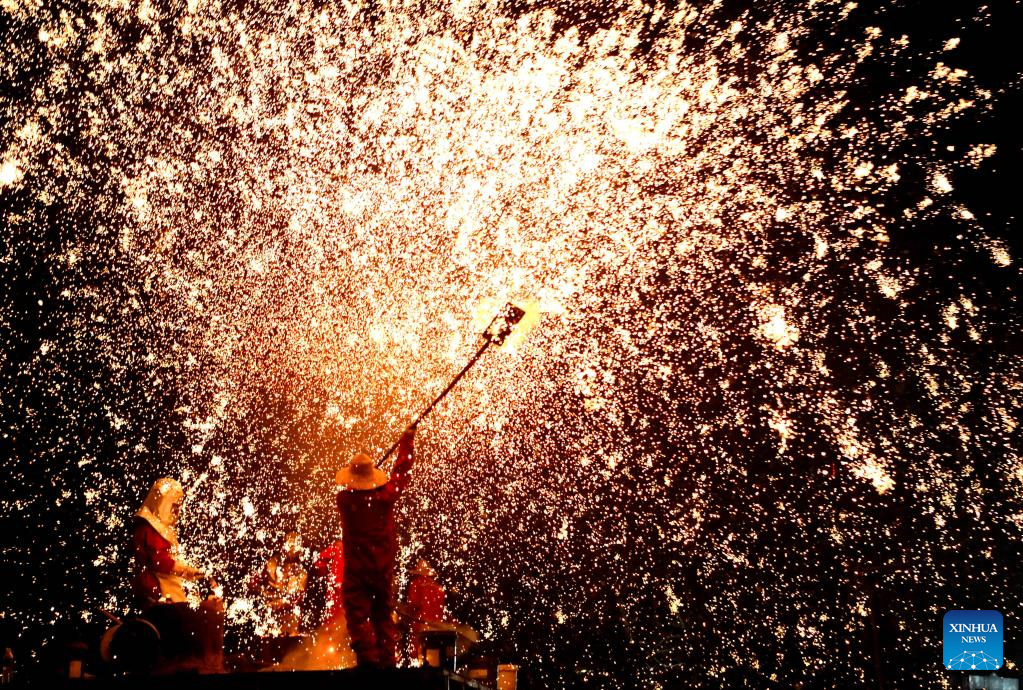 Performers throw molten iron to create fireworks to celebrate the Lantern Festival, in Luoyang, central China's Henan Province, Feb. 14, 2022. The Lantern Festival, the 15th day of the first month of the Chinese lunar calendar, falls on Feb. 15 this year. (Xinhua/Hao Yuan)