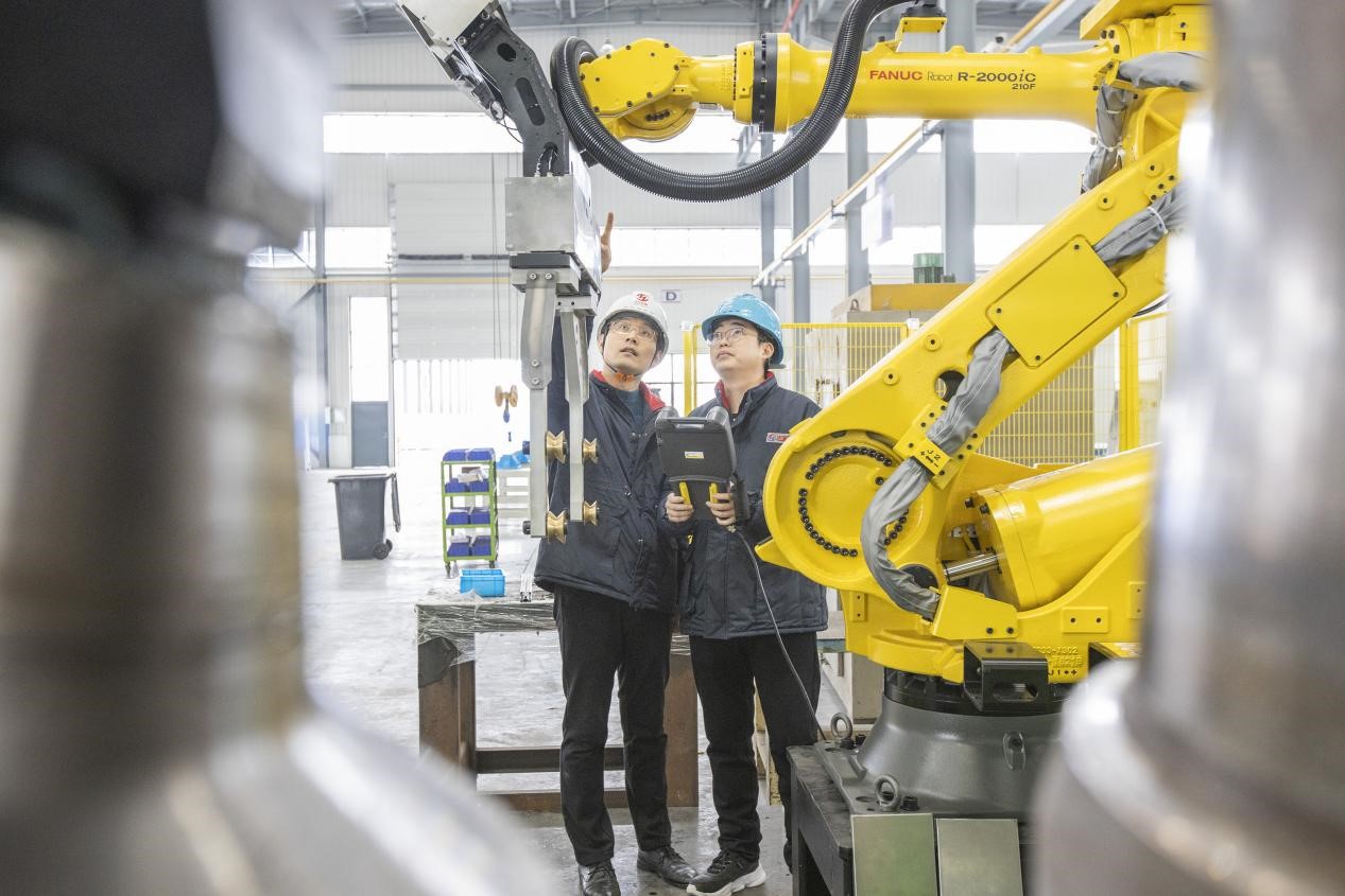 Technicians test and adjust products at an automated aluminum alloy wheel hub production line of Tianhong Intelligent Equipment Co., Ltd. based in an industrial park in Danyang Economic and Technological Development Zone, east China’s Jiangsu province, Feb. 8, 2022. (People’s Daily Online/Feng Jiangjiang)