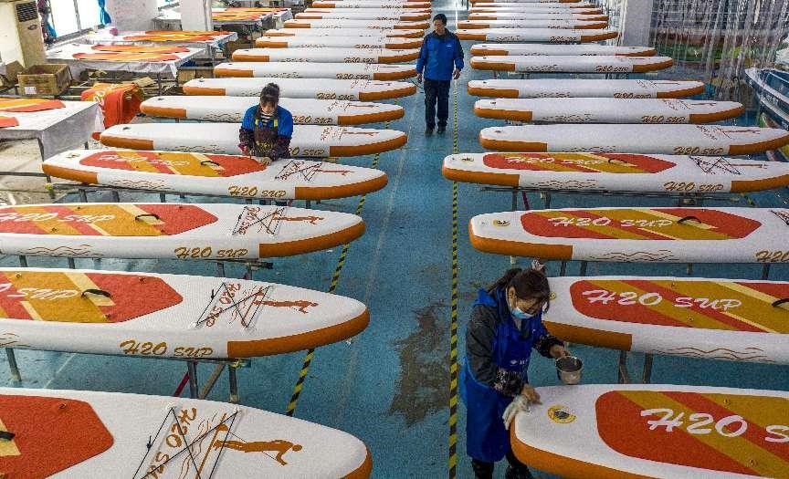 Workers are busy making surfboards for overseas orders at a company in Lujiang county, Hefei city, east China’s Anhui province, Feb. 14, 2022. (People’s Daily Online/Zuo Xuechang)