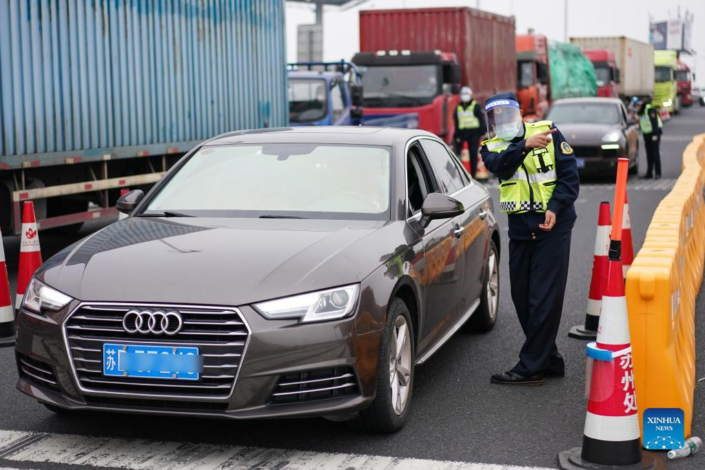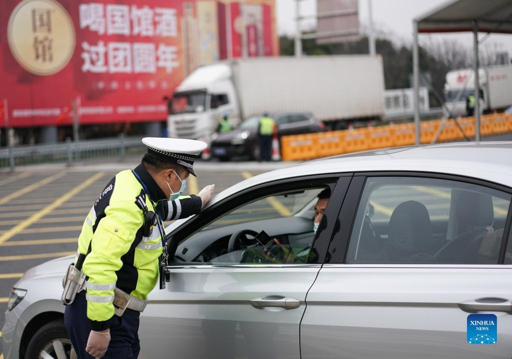 A traffic police officer is on duty at Suzhou New District toll station of Beijing-Shanghai Expressway in Suzhou, east China's Jiangsu Province, Feb. 15, 2022. Suzhou has closed 15 highway entrances and set up 31 highway exit inspection points in the whole city since Feb. 15. Drivers and passengers are required to carry proof of negative results from nucleic acid tests taken within the previous 48 hours, and green health codes. (Xinhua/Ji Chunpeng)