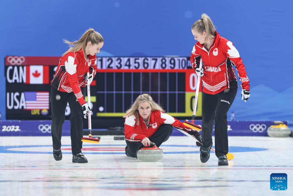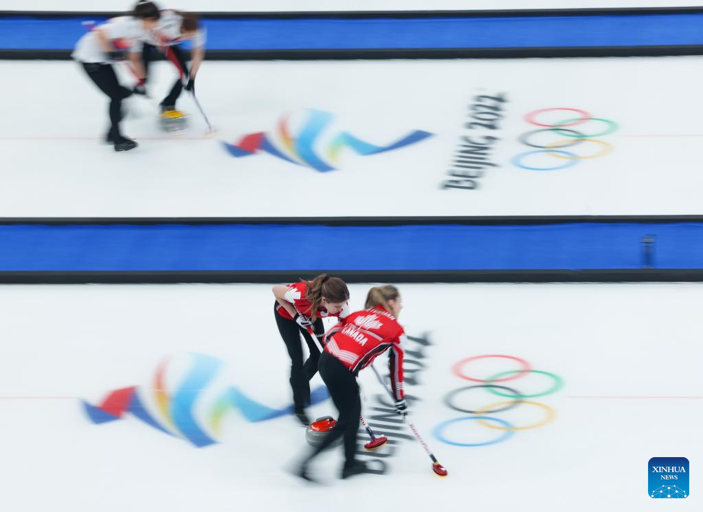 Kaitlyn Lawes (L bottom) and Jocelyn Peterman (R bottom) of Canada compete during the curling women's round robin session 10 of Beijing 2022 Winter Olympics between the United States and Canada at National Aquatics in Beijing, capital of China, Feb. 16, 2022. (Xinhua/Wang Jingqiang)