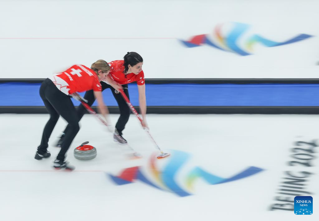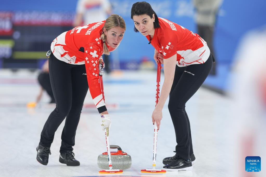 Esther Neuenschwander (R) and Melanie Barbezat of Switzerland compete during the curling women's round robin session 10 of Beijing Winter Olympics between Switzerland and South Korea at National Aquatics Centre in Beijing, capital of China, Feb. 16, 2022. (Xinhua/Wang Jingqiang)
