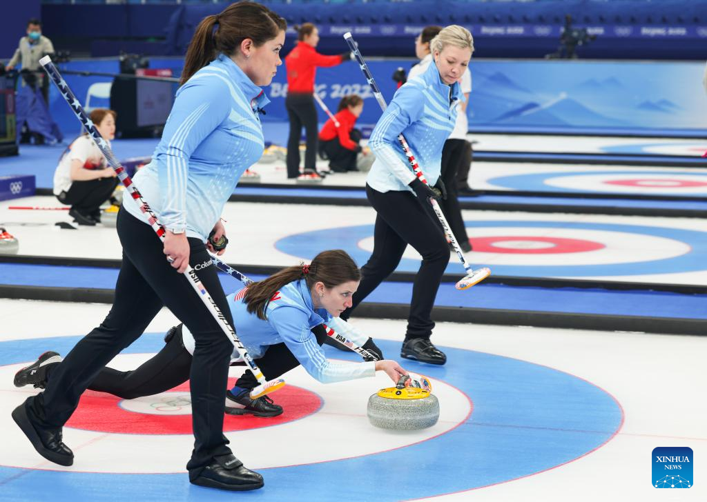 (R to L) Nina Roth, Tara Peterson and Becca Hamilton of the United States compete during the curling women's round robin session 10 of Beijing 2022 Winter Olympics between the United States and Canada at National Aquatics in Beijing, capital of China, Feb. 16, 2022. (Xinhua/Wang Jingqiang)