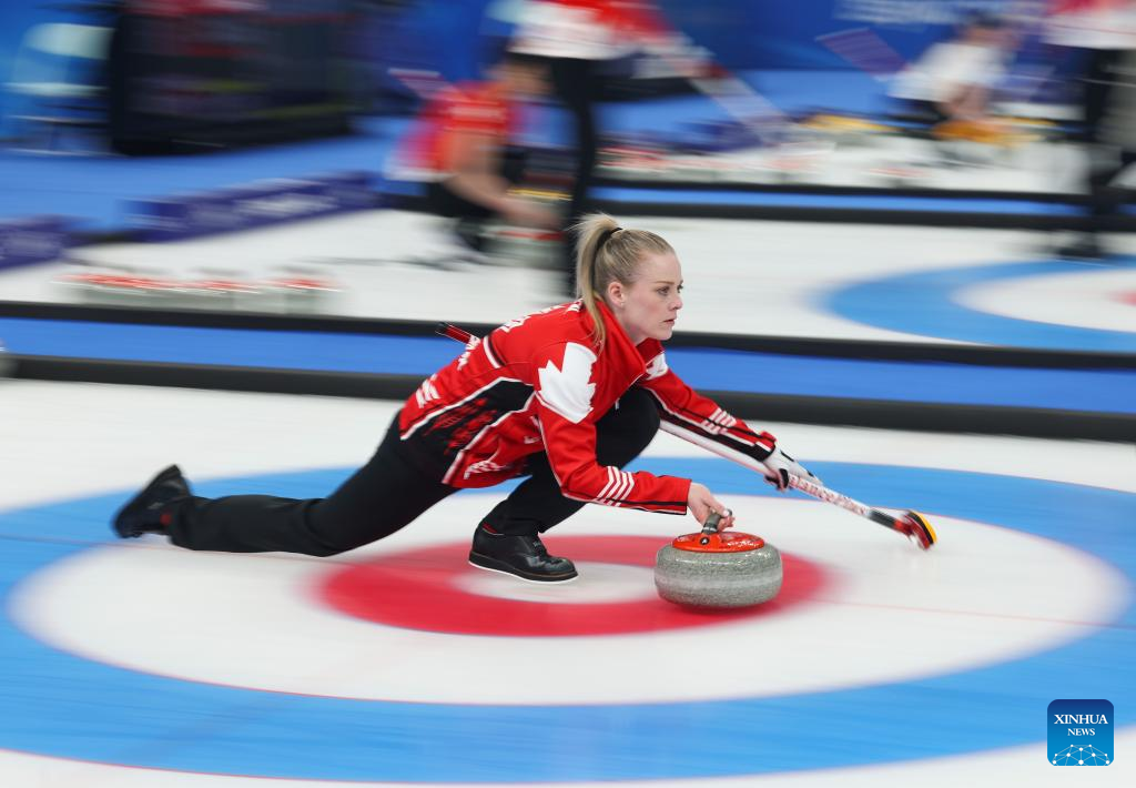 Dawn Mcewen of Canada competes during the curling women's round robin session 10 of Beijing 2022 Winter Olympics between the United States and Canada at National Aquatics in Beijing, capital of China, Feb. 16, 2022. (Xinhua/Wang Jingqiang)
