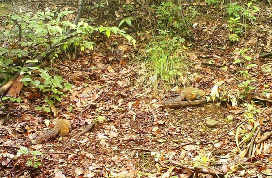 Photo shows two dremomys pyrrhomerus photographed with an infrared camera. (Photo courtesy of Huping Mountain National Nature Reserve)