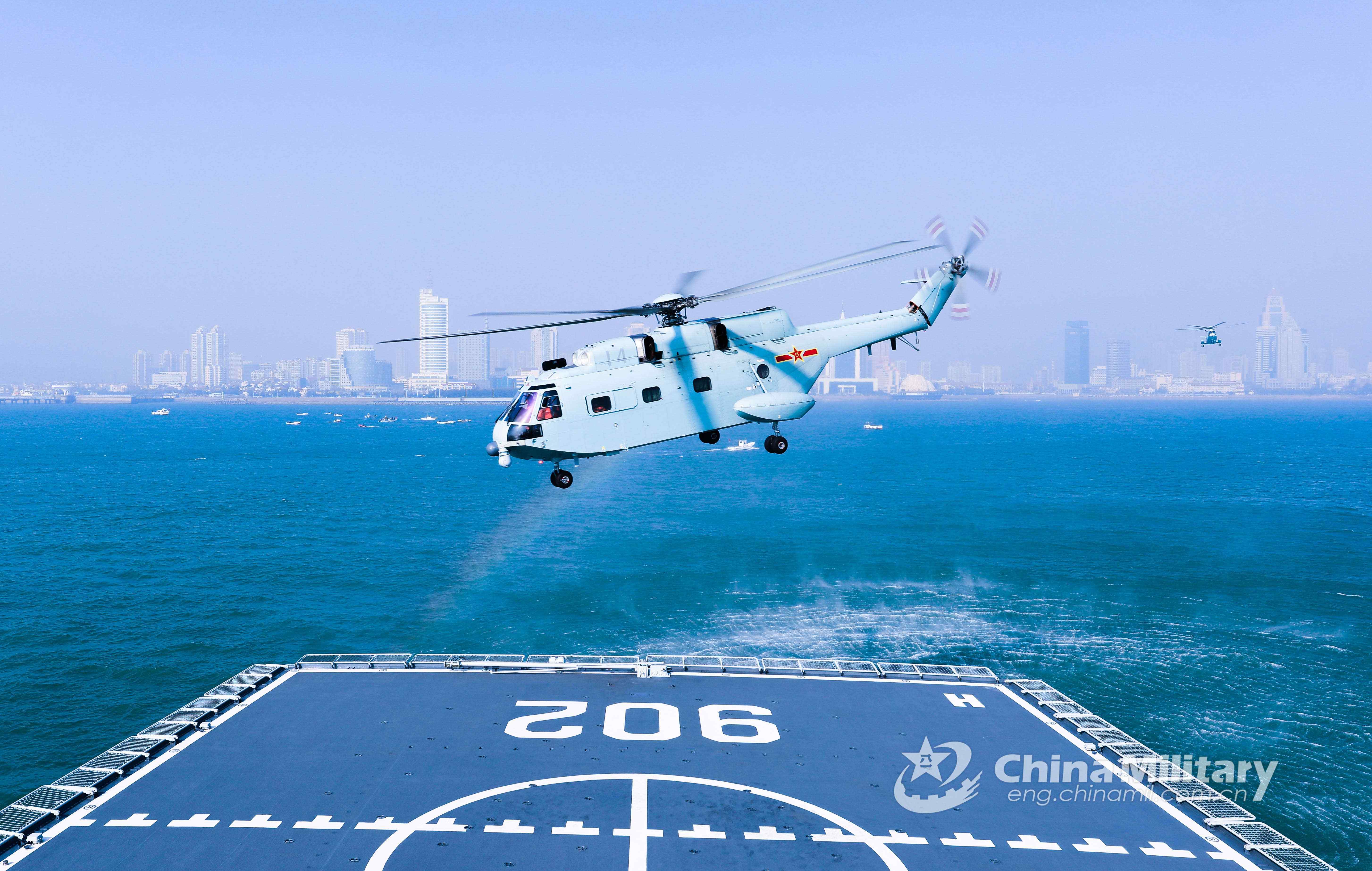 A ship-borne helicopter attached to a brigade under the PLA Navy Marine Corps lands on the flight deck of the comprehensive supply ship Dongpinghu (Hull 902) during a landing operation on January 8, 2022. (eng.chinamil.com.cn/Photo by Cong Lianying)