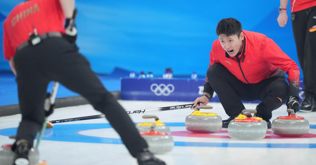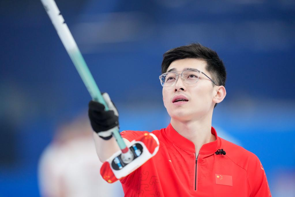 Xu Jingtao of China competes during the curling men's round robin session 11 of Beijing 2022 Winter Olympics between China and Switzerland at National Aquatics Centre in Beijing, capital of China, Feb. 16, 2022. (Xinhua/Zhou Mi)