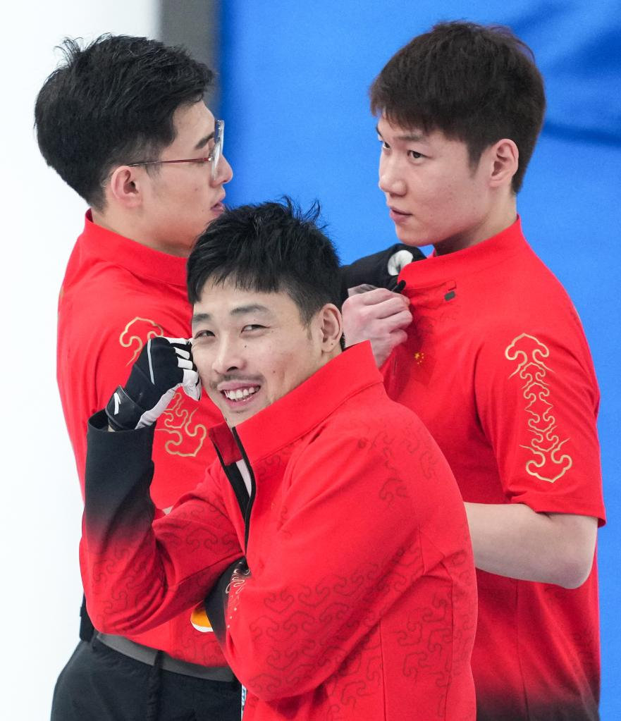Xu Jingtao, Zou Qiang and Wang Zhiyu (from L to R) of China react during the curling men's round robin session 11 of Beijing 2022 Winter Olympics between China and Switzerland at National Aquatics Centre in Beijing, capital of China, Feb. 16, 2022. (Xinhua/Zhou Mi)