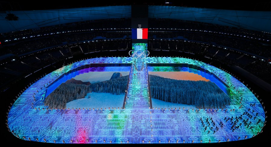 The Olympic delegation of France parade into the National Stadium during the opening ceremony of the Beijing 2022 Olympic Winter Games in Beijing, capital of China, Feb. 4, 2022. (Xinhua/Chen Yichen)