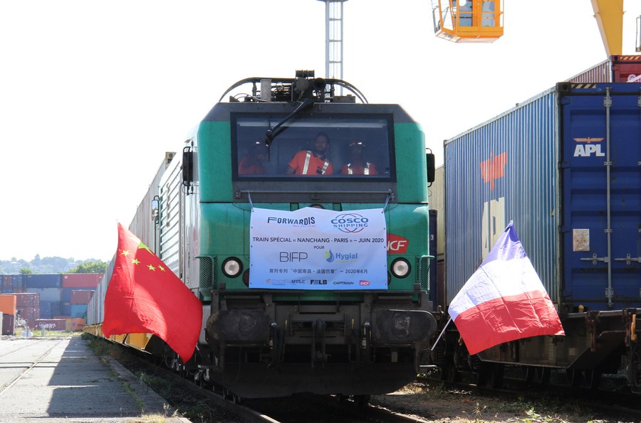 The China-Europe cagro train arrives at Paris, France, June 23, 2020. (Xinhua/Xu Yongchun)