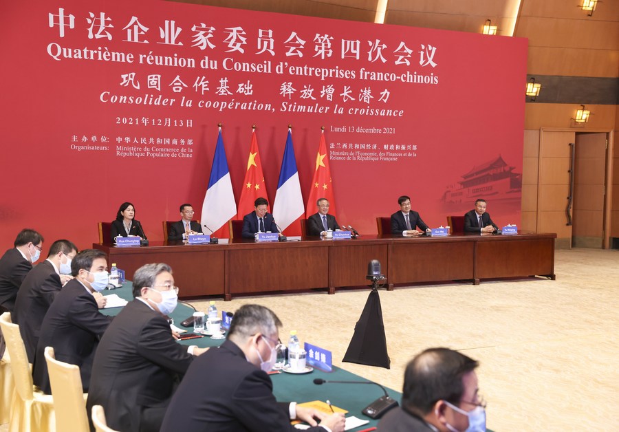 Chinese Vice Premier Hu Chunhua and French Economy and Finance Minister Bruno Le Maire attend the closing ceremony of the fourth meeting of the Chinese-French council of entrepreneurs after co-chairing the eighth China-France High-Level Economic and Financial Dialogue via video link on Dec. 13, 2021. (Xinhua/Pang Xinglei)