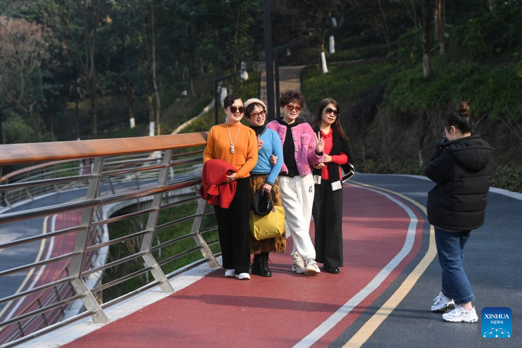 Tourists pose for a group photo on a pavement at the former site of Chongqing Iron &Steel Factory in Dadukou District of southwest China's Chongqing Municipality, Feb. 15, 2022. The pavement is one of the 60 characteristic pavements planned by local authorities in the mountainous city of Chongqing. (Xinhua/Wang Quanchao)