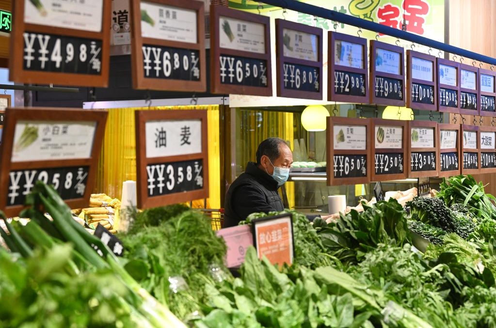 (220216) -- HANDAN, Feb. 16, 2022 (Xinhua) -- A customer shops vegetables at a supermarket in Handan, north China's Hebei Province, Feb. 16, 2022. China's inflation was further tamed in January as food prices saw a decline, while price retreats in coal and steel sectors prompted factory-gate inflation to moderate, official data showed Wednesday. The consumer price index (CPI), a main gauge of inflation, rose 0.9 percent year on year in January, down from the 1.5-percent increase a month ago, data from the National Bureau of Statistics (NBS) showed. (Photo by Hao Qunying/Xinhua)