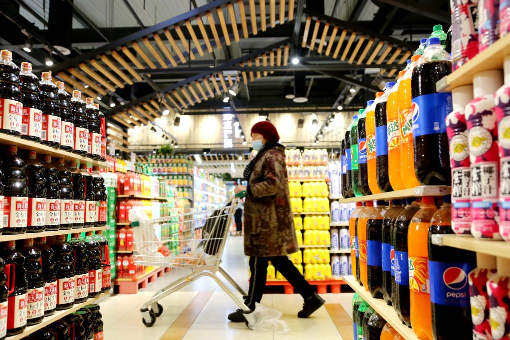 A staff member works at a supermarket in Bijie, southwest China's Guizhou Province, Feb. 16, 2022. China's inflation was further tamed in January as food prices saw a decline, while price retreats in coal and steel sectors prompted factory-gate inflation to moderate, official data showed Wednesday. The consumer price index (CPI), a main gauge of inflation, rose 0.9 percent year on year in January, down from the 1.5-percent increase a month ago, data from the National Bureau of Statistics (NBS) showed. (Photo by Wang Chunliang/Xinhua)