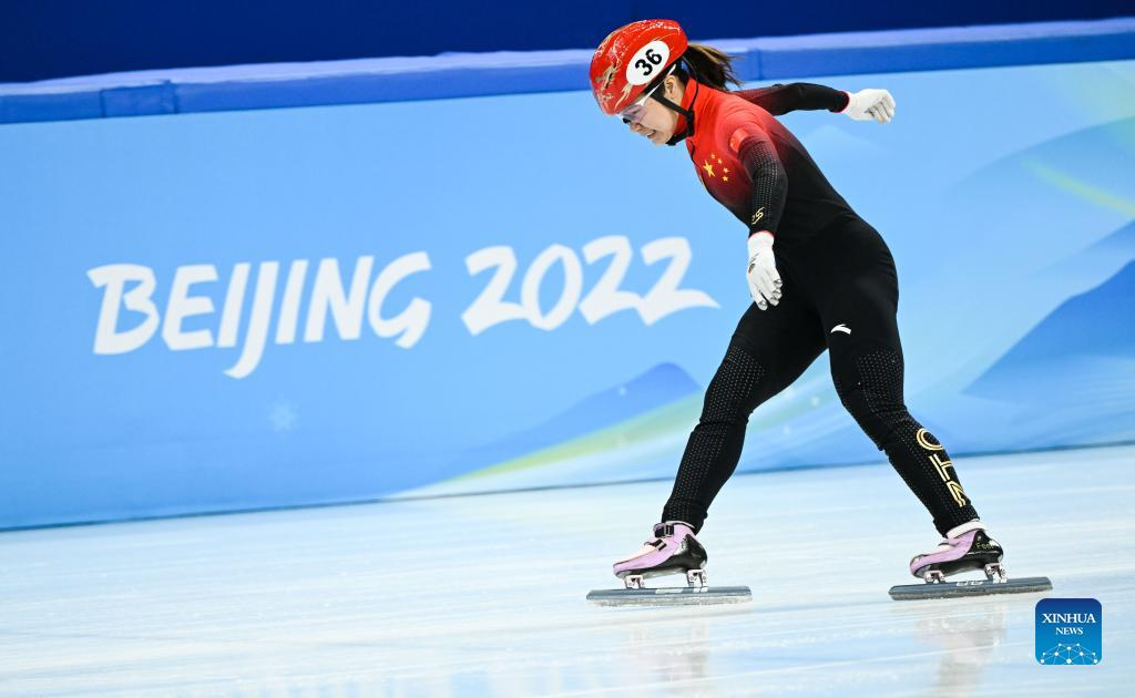 Han Yutong of China reacts during the women's 1,500m semifinal of short track speed skating at Capital Indoor Stadium in Beijing, capital of China, Feb. 16, 2022. (Xinhua/Li Yibo)