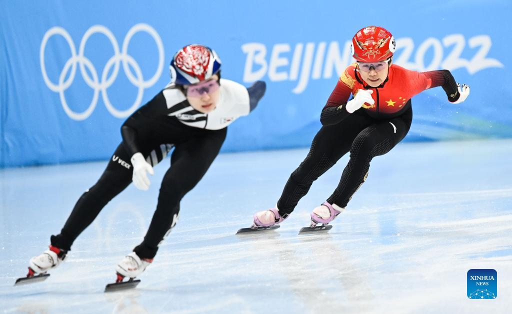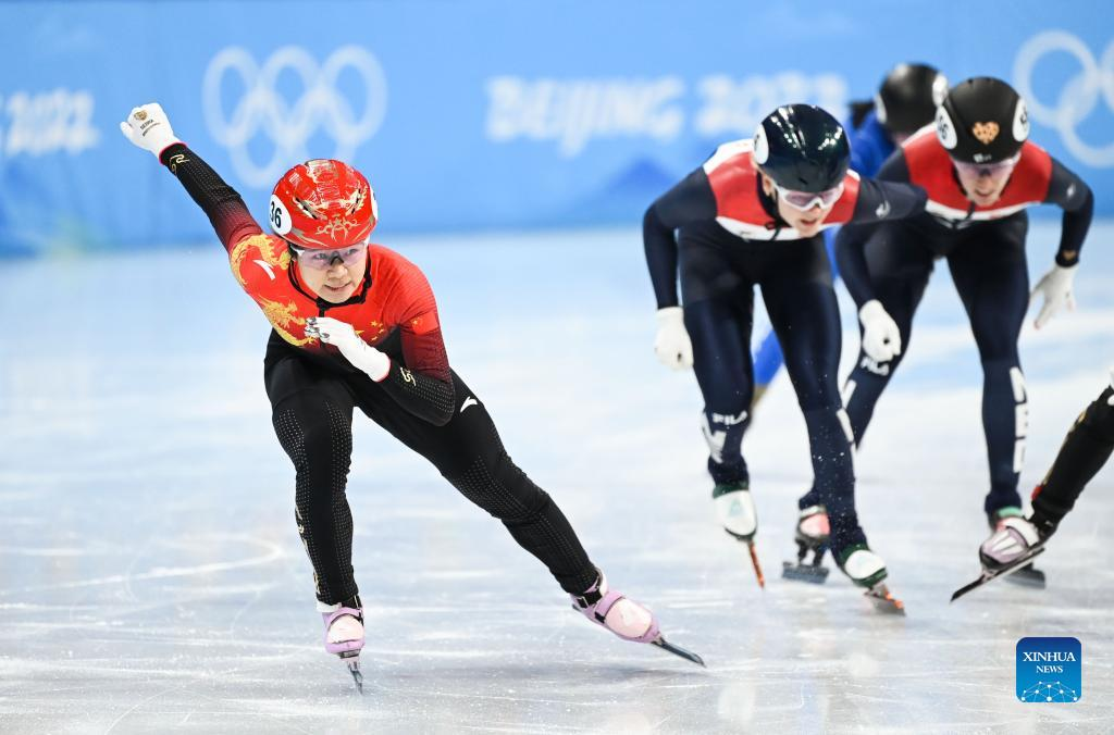 Han Yutong (L) of China competes during the women's 1,500m semifinal of short track speed skating at Capital Indoor Stadium in Beijing, capital of China, Feb. 16, 2022. (Xinhua/Xiong Qi)