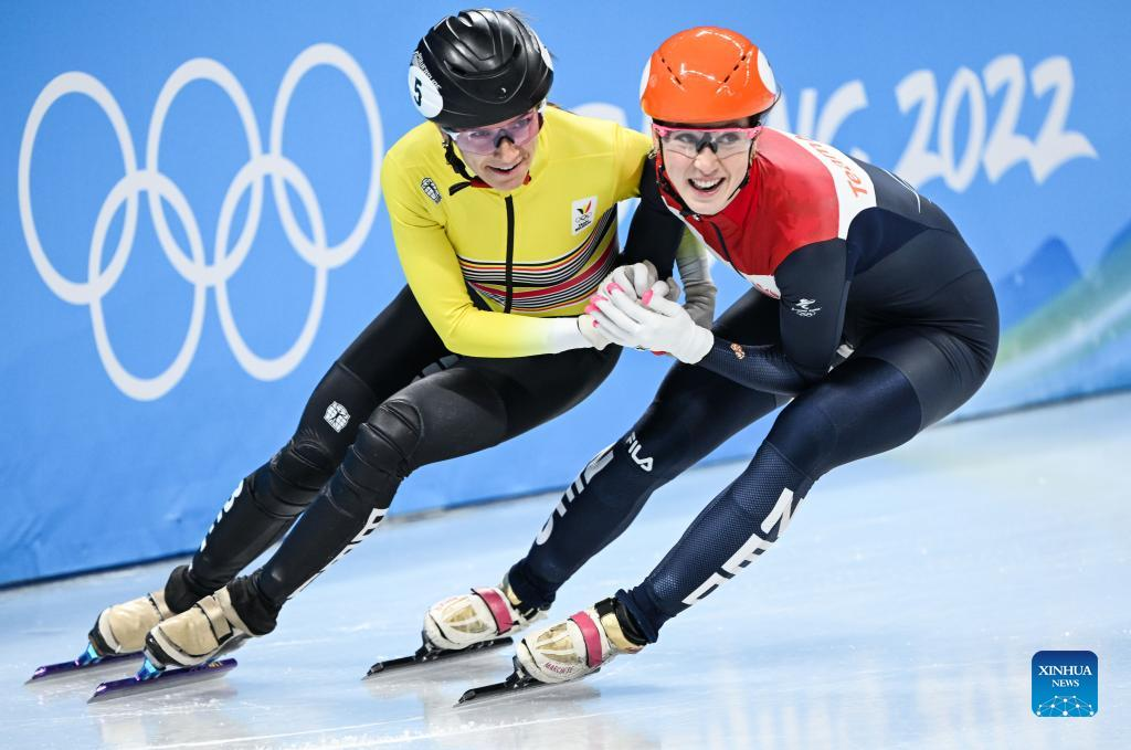 Hanne Desmet (L) of Belgium and Suzanne Schulting of the Netherlands react after the women's 1,500m semifinal of short track speed skating at Capital Indoor Stadium in Beijing, capital of China, Feb. 16, 2022. (Xinhua/Li Yibo)