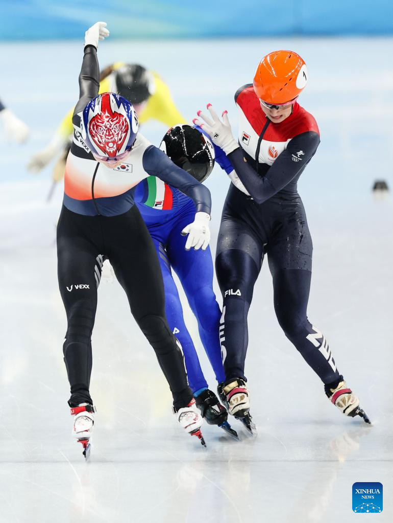 Choi Minjeong of South Korea, Arianna Fontana of Italy and Suzanne Schulting of the Netherlands (L to R) react after the women's 1,500m final of short track speed skating at Capital Indoor Stadium in Beijing, capital of China, Feb. 16, 2022. (Xinhua/Wang Yuguo)