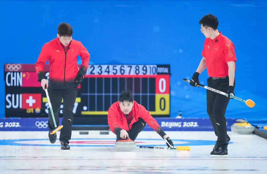 Wang Zhiyu, Zou Qiang, Xu Jingtao (L to R) of China compete during the curling men's round robin session 11 of Beijing Winter Olympics against Switzerland at National Aquatics Center in Beijing on Feb. 16, 2022. (Xinhua/Zhou Mi)