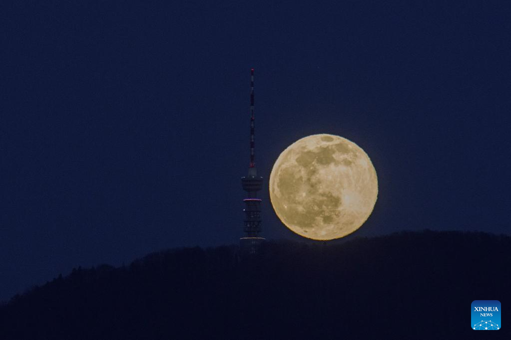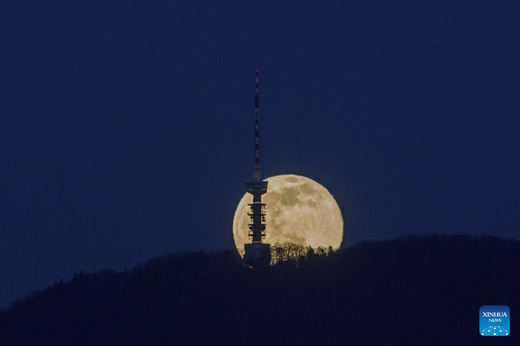 The moon rises behind a TV and radio tower in Zagreb, Croatia, on Feb. 16, 2022. (Davor Puklavec/PIXSELL via Xinhua)