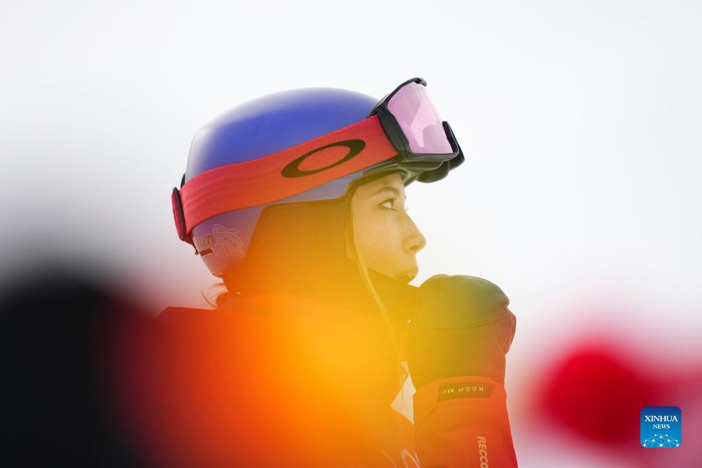 Chinese athlete Gu Ailing prepares to start during the freestyle skiing women's freeski halfpipe qualification of Beijing 2022 Winter Olympics at Genting Snow Park in Zhangjiakou, north China's Hebei Province, Feb. 17, 2022. (Xinhua/Xu Chang)