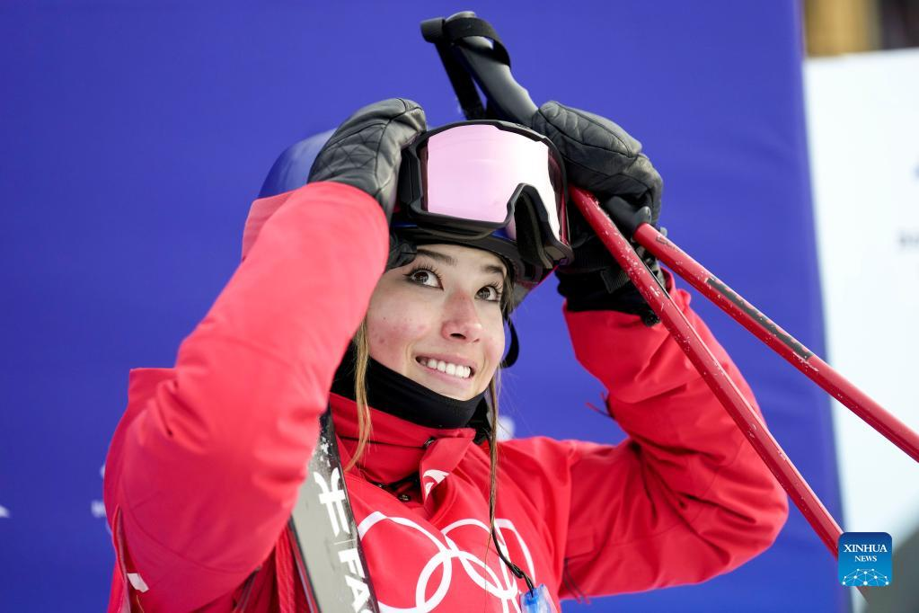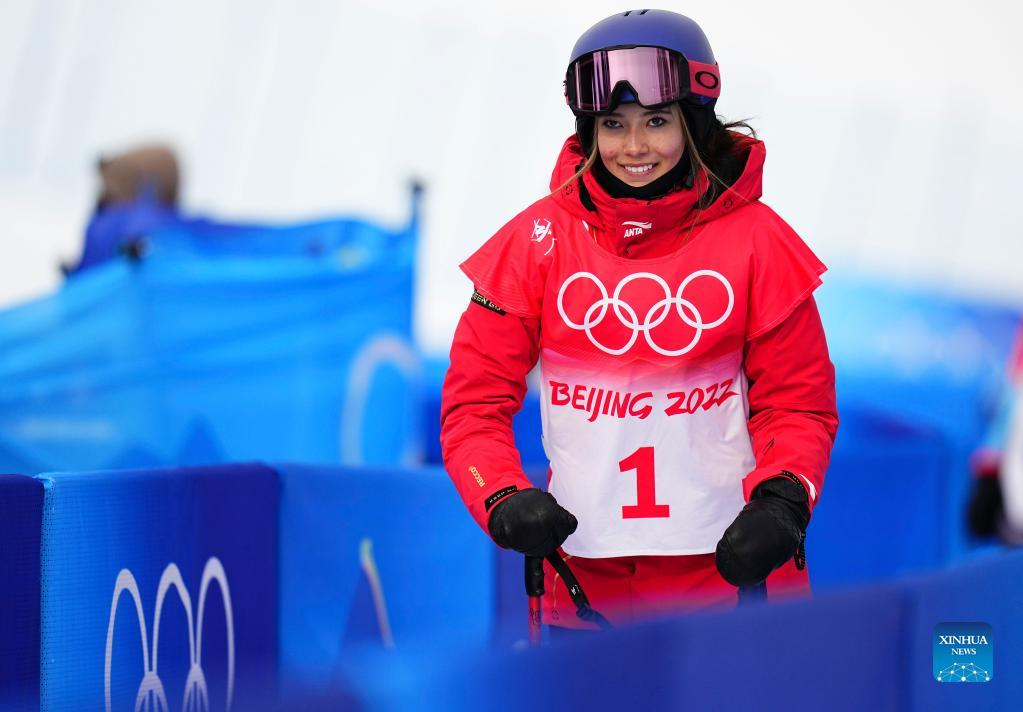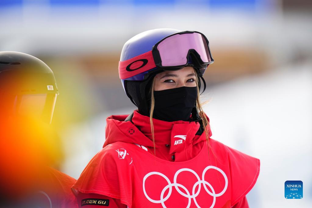 Chinese athlete Gu Ailing reacts during the freestyle skiing women's freeski halfpipe qualification of Beijing 2022 Winter Olympics at Genting Snow Park in Zhangjiakou, north China's Hebei Province, Feb. 17, 2022. (Xinhua/Xue Yubin)