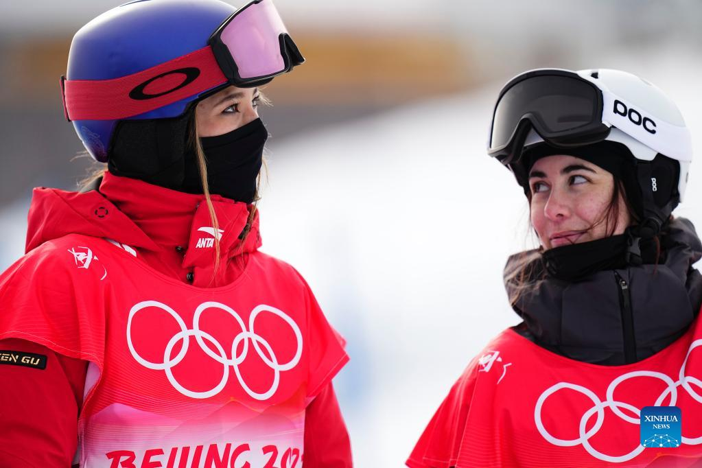 Chinese athlete Gu Ailing (L) and Rachael Karker of Canada react during the freestyle skiing women's freeski halfpipe qualification of Beijing 2022 Winter Olympics at Genting Snow Park in Zhangjiakou, north China's Hebei Province, Feb. 17, 2022. (Xinhua/Xu Chang)