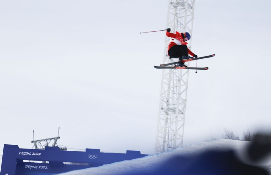 Chinese athlete Gu Ailing competes during the freestyle skiing women's freeski halfpipe qualification of Beijing 2022 Winter Olympics at Genting Snow Park in Zhangjiakou, north China's Hebei Province, Feb. 17, 2022. (Xinhua/Fei Maohua)