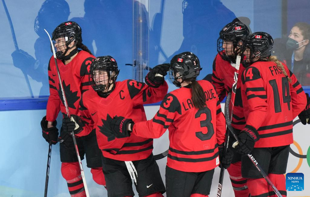 Athletes of Canada celebrate scoring during the ice hockey women's gold medal game of Beijing 2022 Winter Olympics between Canada and the United States at Wukesong Sports Centre in Beijing, capital of China, Feb. 17, 2022. (Xinhua/Li An)