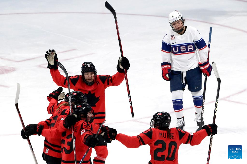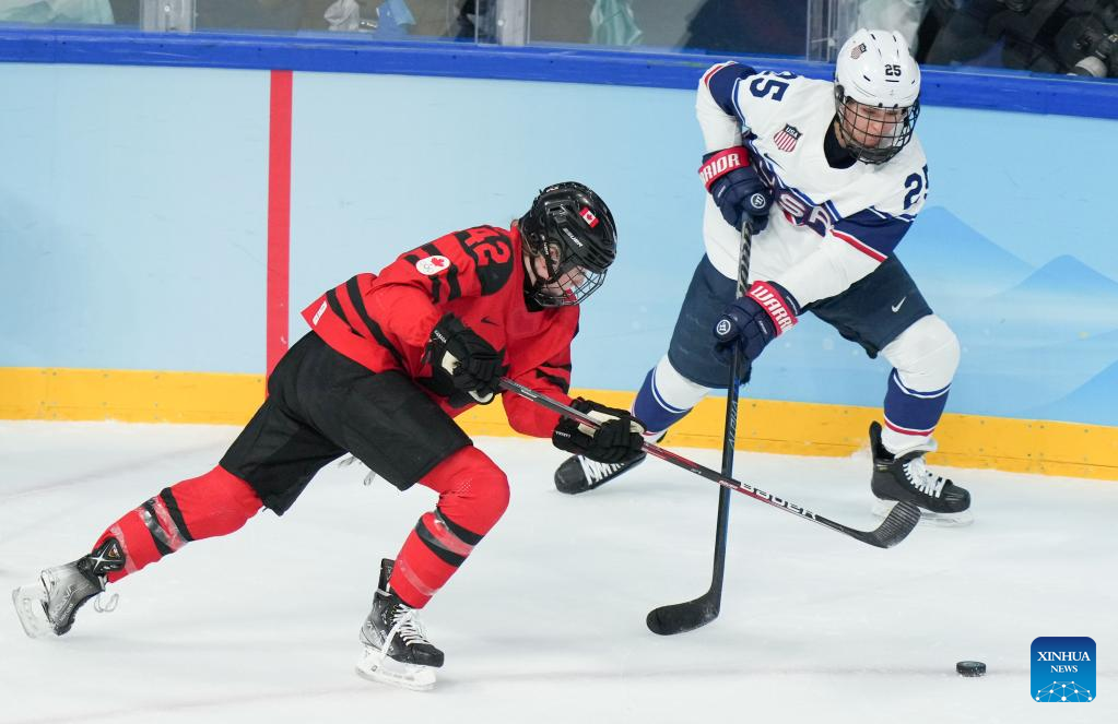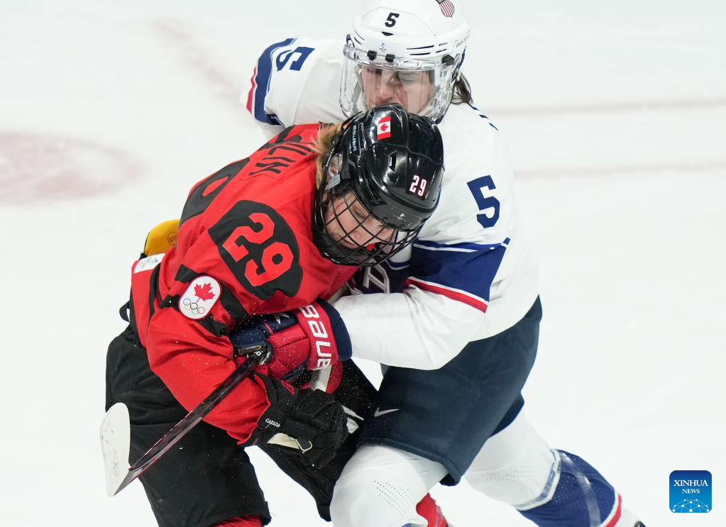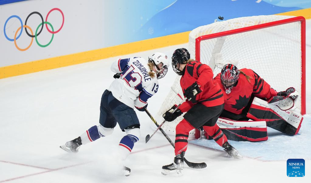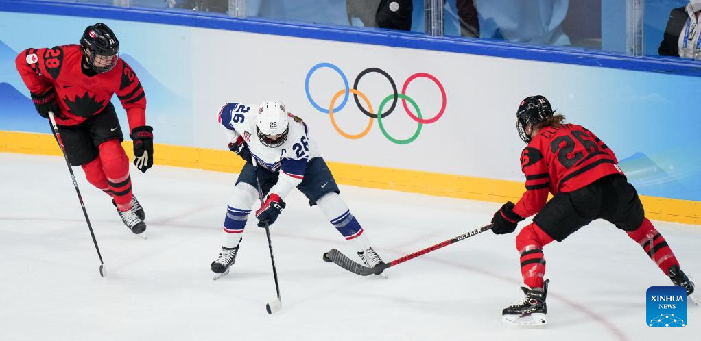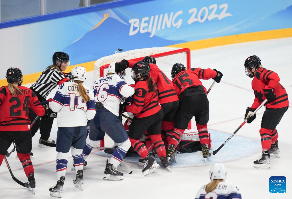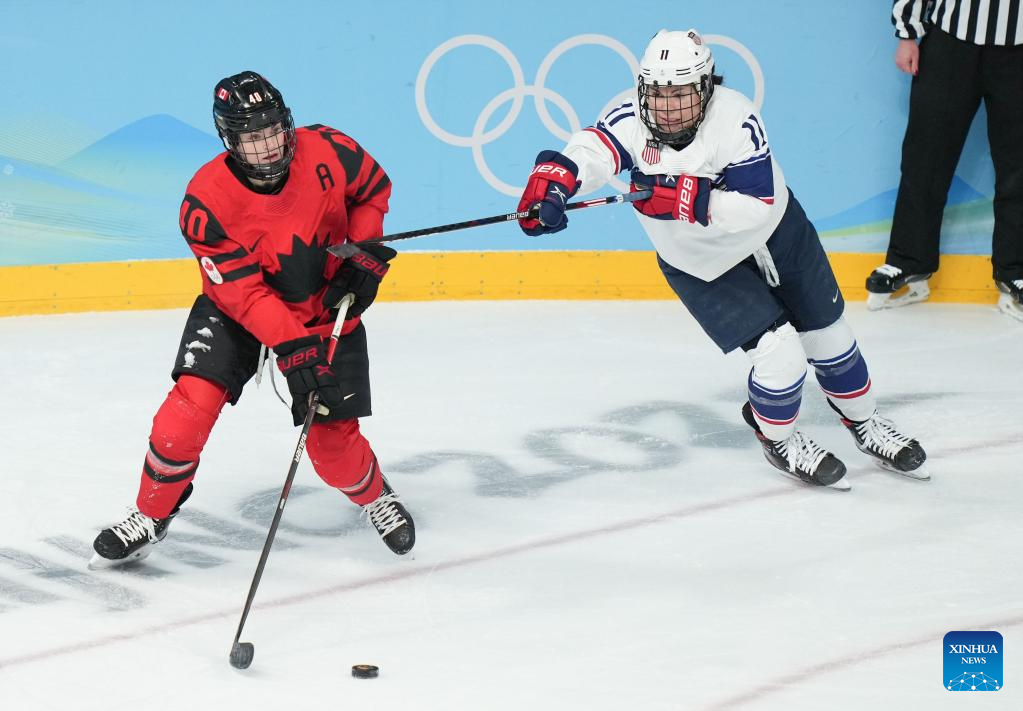 Athletes of Canada and the United States compete during the ice hockey women's gold medal game of Beijing 2022 Winter Olympics between Canada and the United States at Wukesong Sports Centre in Beijing, capital of China, Feb. 17, 2022. (Xinhua/Meng Yongmin)